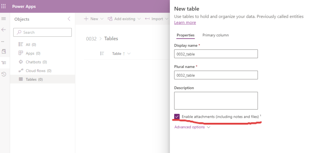 ファイルを添付するテーブルで 添付を有効にします