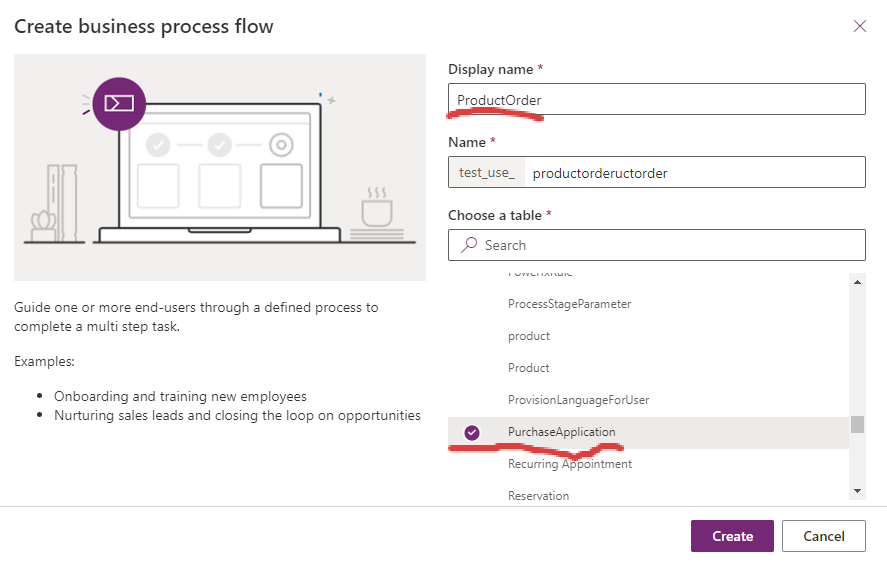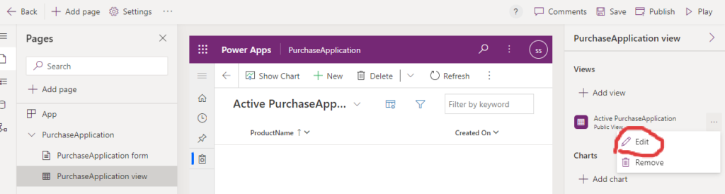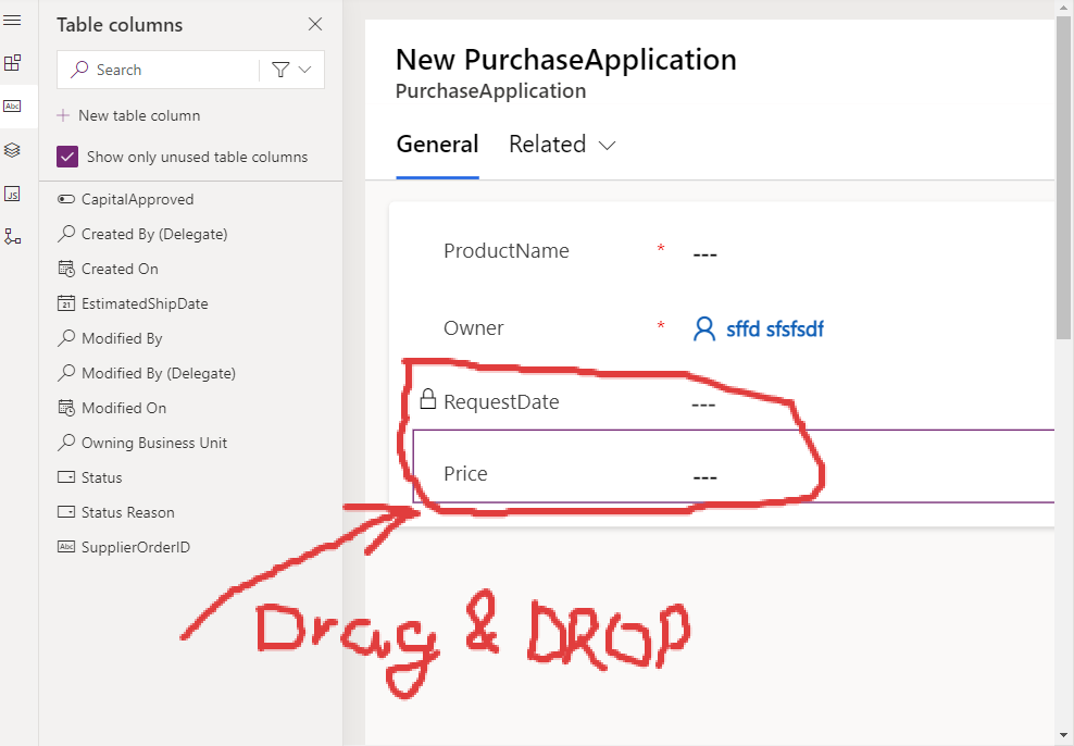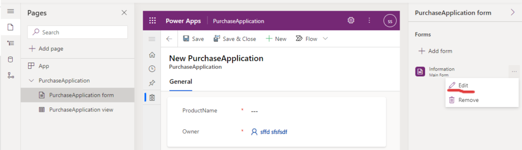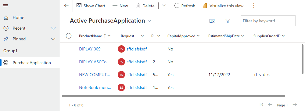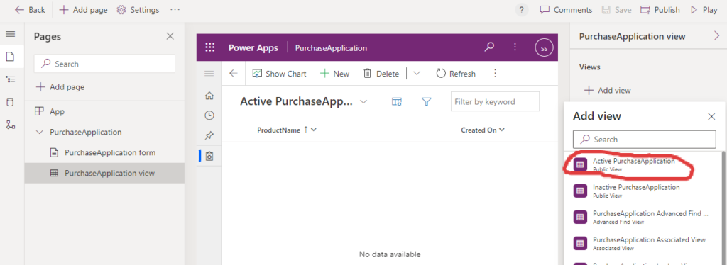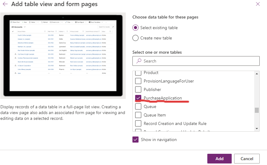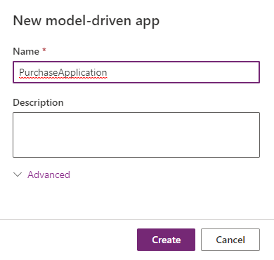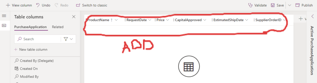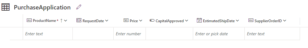 ここでは、Dataverseのテーブル名PurchaseApplicationをエンティティとして扱う。以下のようにtableを作成