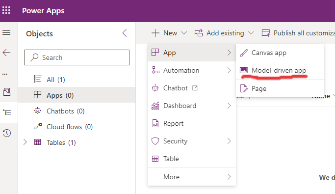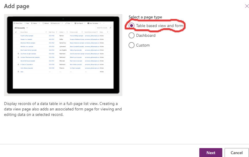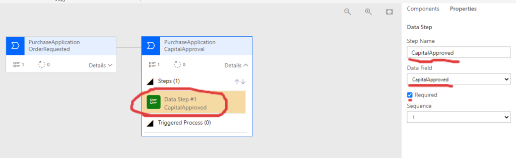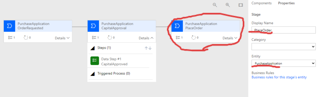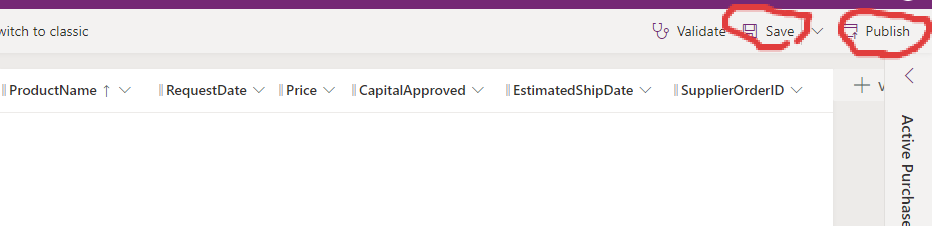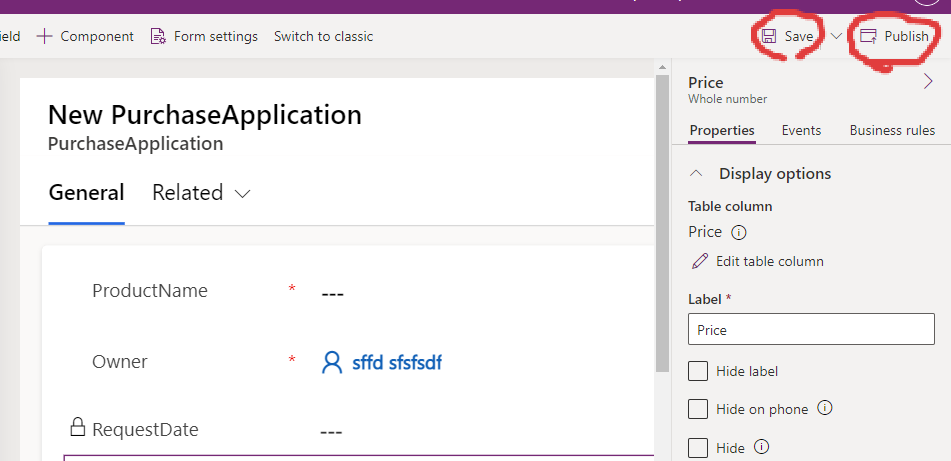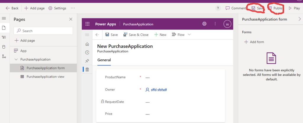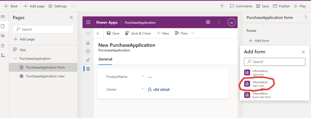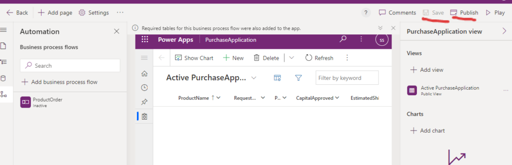 ここでは、Dataverseのテーブル名PurchaseApplicationをエンティティとして扱う。以下のようにtableを作成