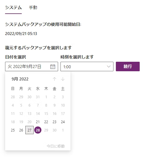 復元したい日時を指定して、続行すると復元できた
