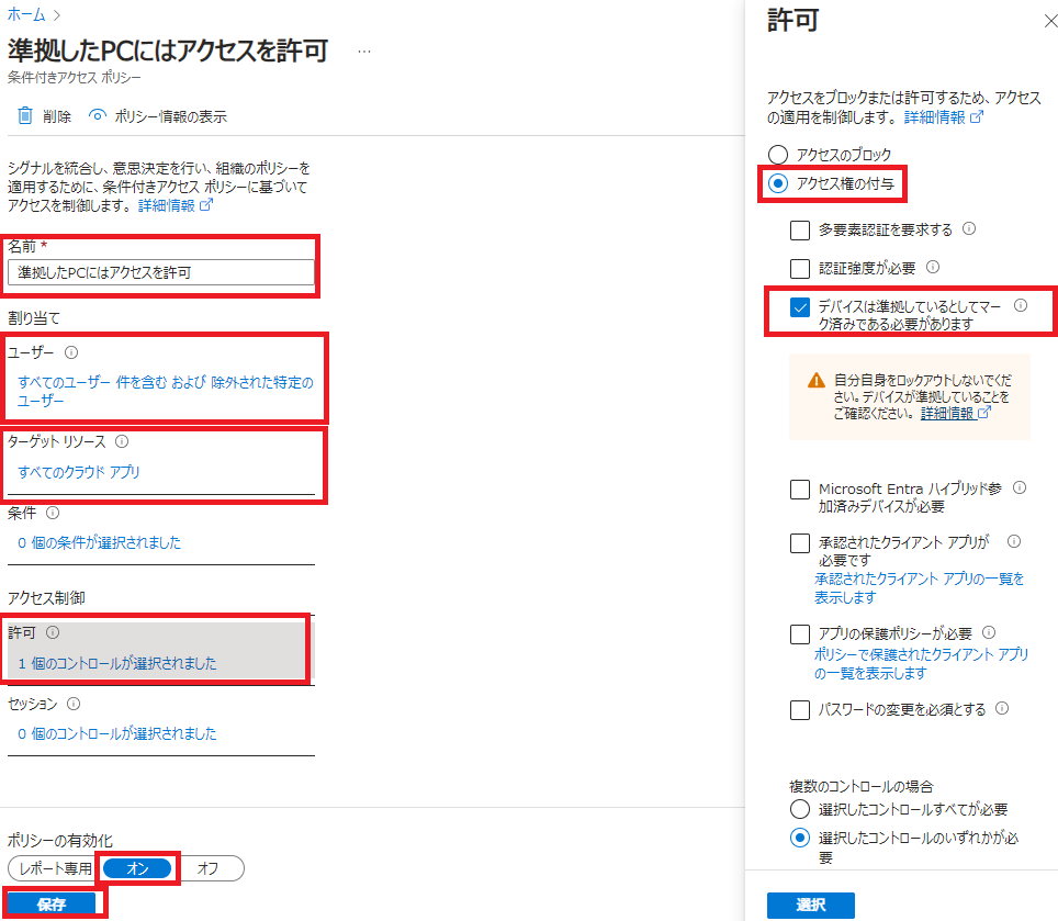 以下に示すように 名前に「準拠したPCにはアクセスを許可」 、ユーザ割り当ての対象に「すべてのユーザ」対象外に管理者 、ターゲットリソースで「すべてのクラウドアプリ」、許可で「アクセス権の付与」と「デバイスは準拠しているとしてマーク済みであるい必要があります」にチェック  ポリシーの有効化に「オン」を設定して「作成」します