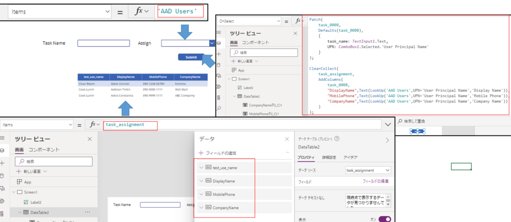 "DisplayName",Text(LookUp('AAD Users',UPN='User Principal Name','Display Name')),