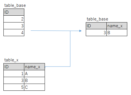 以下のように、二つのテーブル(table_base,table_x)からそれぞれIDフィールドの値が一致するレコードを連結する方法を説明する