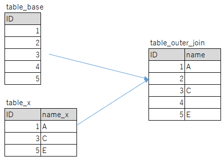 以下のように、二つのテーブル(table_base,table_x)からそれぞれIDフィールドの値が一致するレコード同士は連結し、一致するものが存在しないレコードはそのままtable_outer_joinに出力する方法を説明する