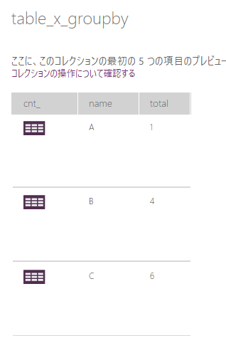 ClearCollect(table_x_groupby,AddColumns(GroupBy(table_x,"name","cnt_"),"total",Sum(cnt_,cnt_)));実行結果